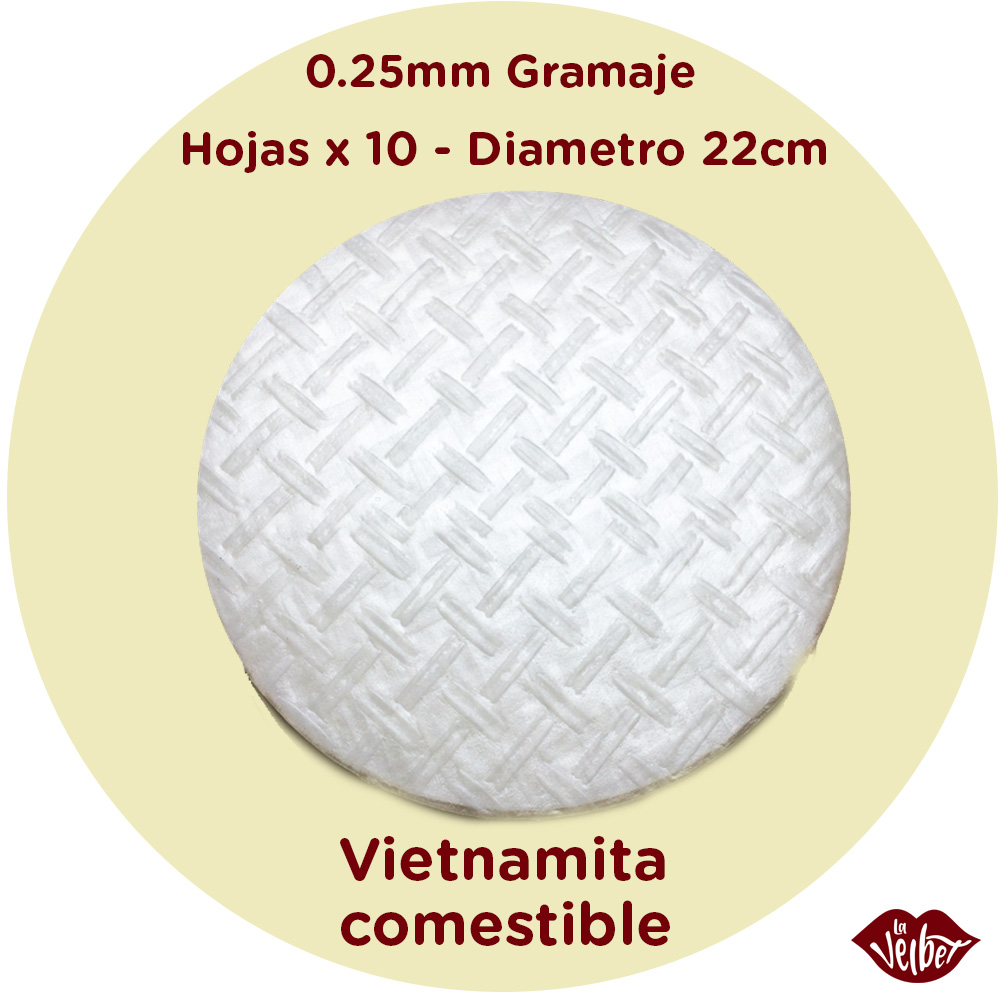 Hojas Vietnamitas son especializadas para poder hacer realidad muchos diseños de tortas. El diámetro es de 22 cm. no es para poder imprimir, son papeles usados en la industria alimentaria pera envolver rollitos chinos o comida, con la diferencia que este papel no tiene sabor y no es salado. El cual lo hace perfecto para no pasar como sabor de comida sino enfocarse a lo dulce.